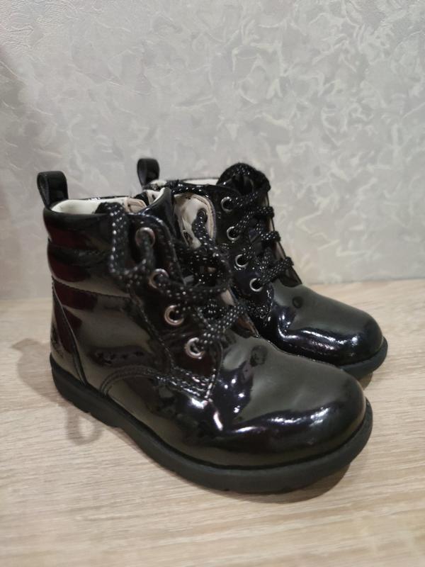 Отличные осенние сапожки из эко кожи, лакированные, состояние идеал. Застежка шнуровка и замочек сбоку, без утепления, стелька полная 14.5 см. Есть незначительные следы эксплуатации, в носке абсолютно не видны, на последнем фото показала (микроцарапины на корпусе)