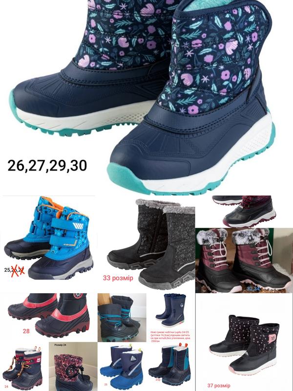 Новые сапоги, ботинки (снобутсы) для мальчика и девочки Немецкой фирмы Lupilu, Pepperts, легкие, теплые с фольгированной стелькой для лучшего сохранения тепла. Идеальны на погоду с мокрым снегом. Отличное качество. Верх - комбинированные материалы водо, ветронепроницаемые, мягкий плюшевый утеплитель, дополнительный внутренний слой термо-флис. Подошва профильная, не скользит, светоотражающие элементы, полномерные модели, наличие размеров на каждом фото.Чобики Lupilu,подошва светится, 650грн(фото2,фото 6),устилка не вынимается, Замеры 24р-16см, длина по подошве 17,2см Замеры 25р-16,5, длина по подошве 18см. Замеры: 28 р 18 см, длина по подошве 20,3 см.Чобики на фото 3,фото 4,фото 5 -цена 800грн, Сапожки Рepperts фото7,8 -цена 900грн.