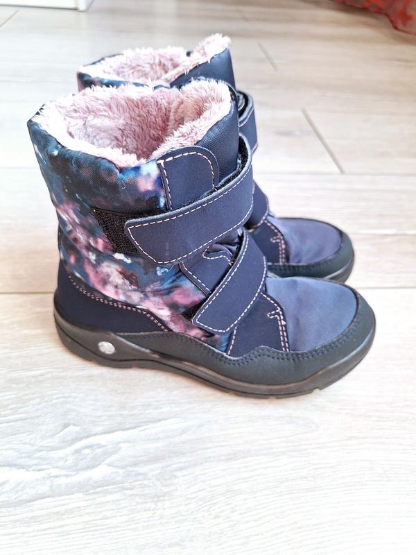 р-р 30,по устілці 19 см( дивіться фото з сантиметром),чудові зимові ботинки на дівчинку,повністю на мякенькому хутрі,непромокаємі і непродуваємі,легенькі та зручні,дуже міцні липучки,є бліді сліди від маркера сзаду,в носці їх зовсім не видно і на носку не впливає,ботинки нові