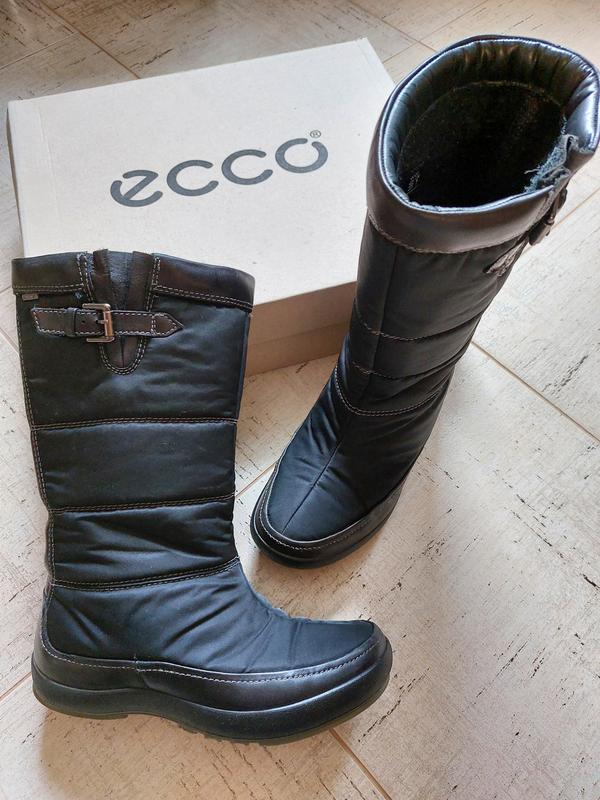 Зимние сапоги ECCO, 36 размер. Верх- кожа/ текстиль, подкладка - шерсть/gore-tex, подошва- полиуретан. Длина стельки с загибом 24 см, на ножку до 23,5 см. Полная высота сапога 30 см. Сапожки в дууже хорошом состоянии. Есть небольшой нюанс, трещинка ткани на 0.5 см. на левом сапоге (последнее фото). Из-за этого не поставила стан идеальным.