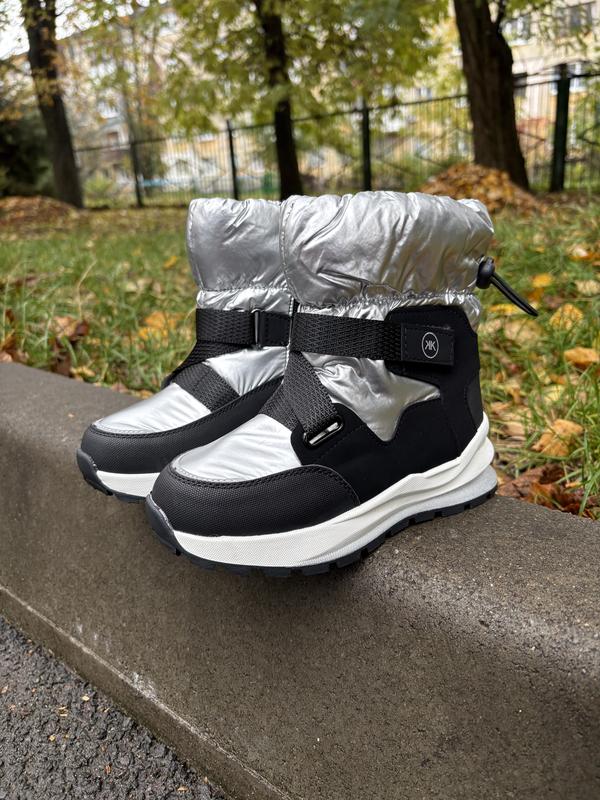 Зимові теплі дутики для дівчаток Сріблястого кольору з чорними вставочками Всередині утеплені товстим шаром штучного хутра Не промокають Підошва не слизька Застібаються на замочок 27 розмір 17,5 см 28 розмір 18 см 29 розмір 18,7 см 30 розмір 19,7 см 31 розмір 20,3 см 32 розмір 21 см