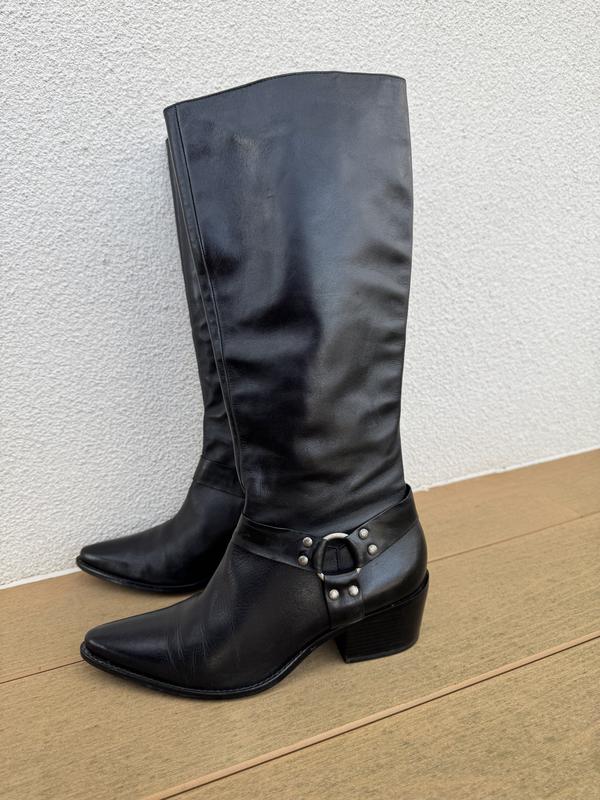 Верх і середина- повністю натуральна шкіра. Устілка 24,5 см, каблук 5,5 см, висота халяви 36 см, об'єм - 37,5 см. Стан ідеальний 😍