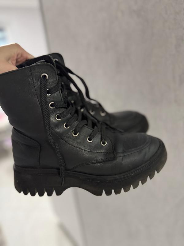 Чорні шкіряні зимові чоботи. Розмір 37. Теплі, носила донька одну зиму, на заміну ще одні були. Мінімальні сліди носіння, одну пряжечку загубили в перший день , за шнурками зовсім не видно її все одно, тому ходила донька без неї. Якщо є питання звертайтесь)