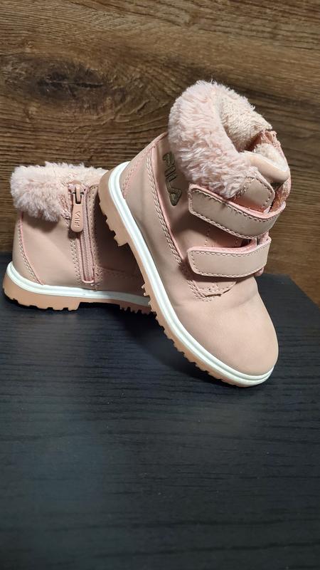 Размер 25.По стельке от края до края 16.5. Детские зимние ботинки для девочки Fila— теплая и комфортная обувь для холодного сезона. Верх изготовлен из экокожи, что обеспечивает долговечность и легкий уход. Текстильная подкладка с утеплителем дарит тепло и комфорт при ношении. Подошва из искусственного материала отличается прочностью. Модель оснащена липучкой для удобного и быстрого обувания. Идеальный вариант для активных прогулок.