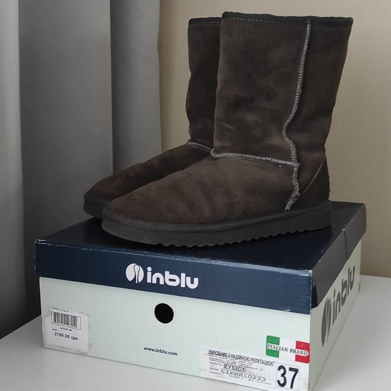 Натуральні замшеві уггі, чоботи від україно-італійського виробника Inblu, в сірому кольорі, 37 розмір. Натуральна замша верху – м'яка, приємна на дотик та довговічна в носінні. Внутрішня підкладка з натуральної вовни – забезпечує ідеальну теплоізоляцію та комфорт. Висота чобота 23 см – оптимальна довжина для захисту ноги та зручності одягання. Довжина устілки 23,5 см. Стан гарний, не порвані і не відклеєні, є сліди носіння але не критичні, єдине що можна освіжити спреєм. Дуже комфортні та теплі. Пересилаю Новою поштою і Укрпоштою, в тому числі і через безпечну оплату.