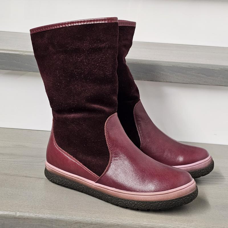 Новые зимние сапожки из натуральной кожи и замши, внутри овчинка, сбоку замок. Обувь изготовлена из натуральных материалов украинской фабрики Bistfor, это безупречное качество! Размеры и длина по стельке : 33-21см, 35-22см