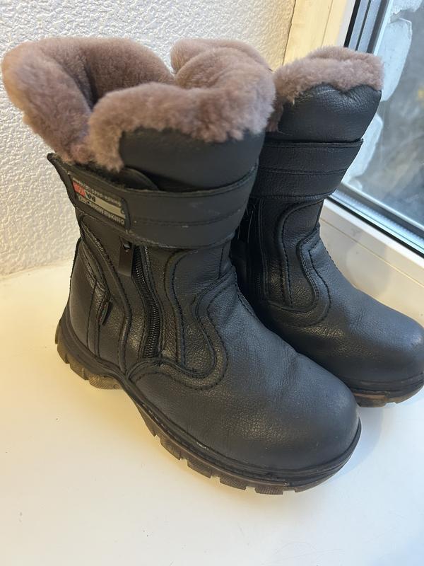Топовая модель зимней детской обуви - натуральные кожаные сапожки на полированной цегеце. Размер 35-длина стельки 22 см. Хорошо смотрятся и красиво сидят на ножке. Носились мало. Фиксируются прочной липучкой, с двух сторон на рабочих молниях. Отошлешь с удовольствием