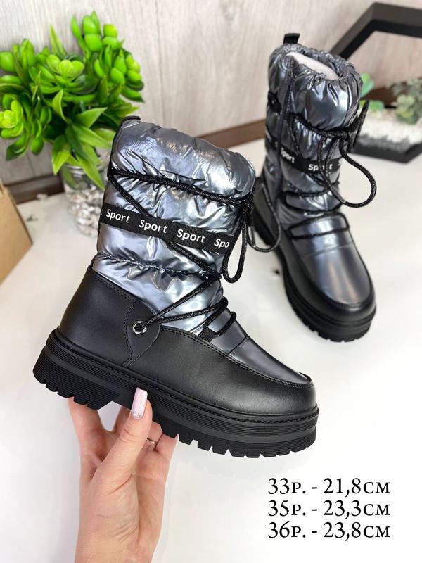Шикарные дутики от Tom.m. Цвет серый металлик. Спереди на шнуровке, в стиле луноходов. Внутри утеплены овчиной (60% натур.). Сбоку молния, есть защита от протечек влаги. Легенькі. Стильно смотрятся на ножке. 1200 грн 33р. - 21,8см 35р. - 23,3см 35р. - 23,3см 36р. - 23,8см Измерение сделано внутри по стельке лично мной, погрешность 1-2мм допустима.