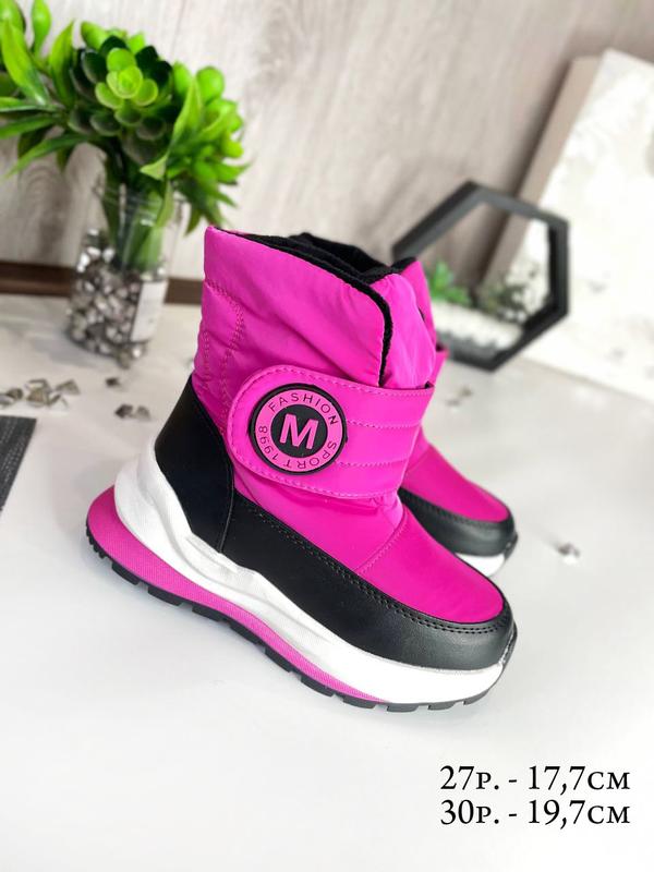 Крутезні яскраво-рожеві зимові дутики. Добре фіксують ніжку липучкою. Всередині тепле густе штучне хутро. Моделька легесенька. 1000грн 27р. - 17,7см 30р. - 19,7см Вимірювання зроблено всередині по устілці особисто мною, похибка 1-2мм допустима.