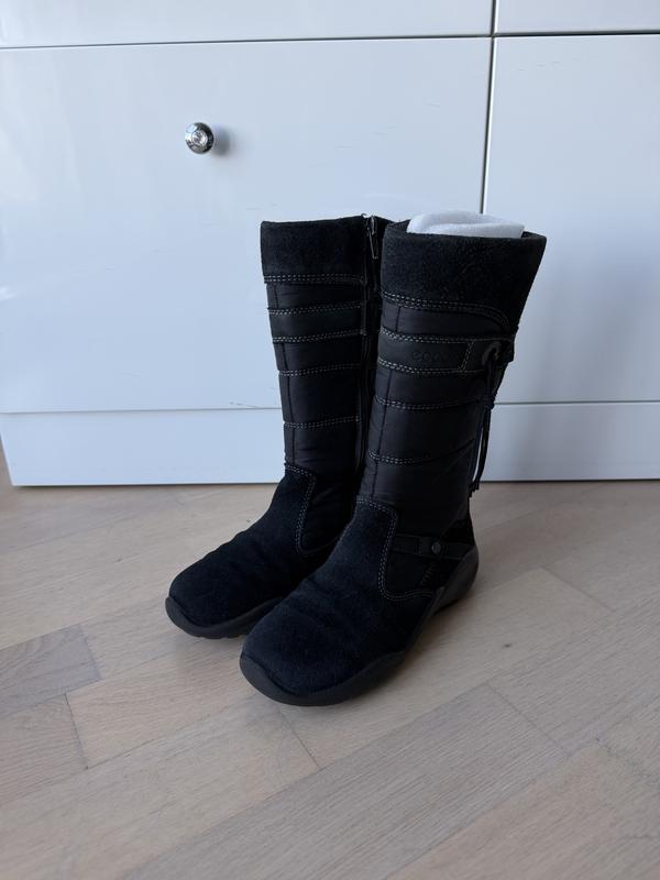 У відмінному стані. Якщо підфарбувати замш виглядатимуть як нові. На одному з чобітків відірвалась замшева підвіска. Можна на обох чобітках замінити на будь-яку іншу підвіску. Зовні нейлон і замш. Вказано, що непромокаючі. Бажано перед кожним сезоном обробляти гідрофобним аерозолем. Зсередини утеплення gore-tex і фліс. Висота чобітків від підлоги 27 см. Півобхват гомілки 14 см. (З урахуванням товщини чобітків гадаю підійдуть на обхват ікри не більше 26 см). По устілці 20,5 см.