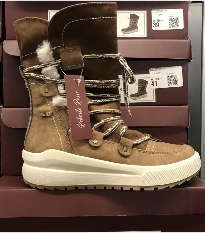 Теплі та легкі зимові черевики на шнурівці. Забезпечують сухість завдяки водовідштовхувальній мембрані TEX. М'яка підкладка всередині та дуже легкі для стопи. Гумова підошва забезпечує гарне зчеплення на слизьких поверхнях. Без явних дефектів. Устілка 24см