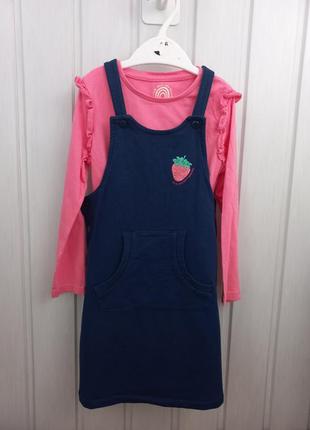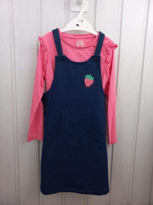 дуже зручно для садочка Сарафан трикотажний, реглан можна будь-який😊стан дуже гарний. На реглані на рукавчику є непомітний нюанс плямка від мильної бульбашки, можна усунути.
