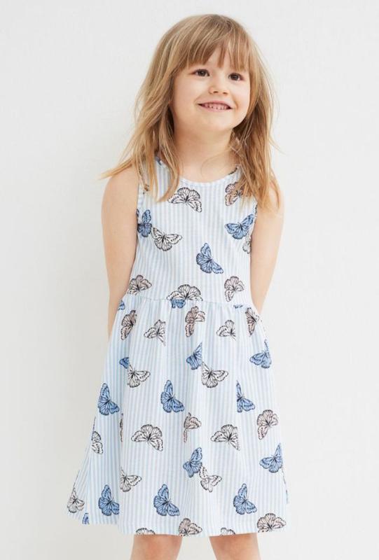 Платье H&M без рукавов из хлопкового трикотажа с набивным рисунком. Собранный шов на талии и расклешенная юбка. Состав Хлопок 100% Размер EUR 92 / UK 1.5-2 Y Длина 50см, пог 25.5 см, длина верха 21,5,юбки 28,5 см EUR 98-104 / UK 2-4 Y Длина 55см, пог 27 см, длина верха 23,5,юбки 31,5 см EUR 110-116 / UK 4-6 Y Длина 60см, пог 29см, длина верха 25,5,юбки 34,5 см EUR 122-128 / UK 6-8 Y Длина 68см, пог 31 см, длина верха 29, юбки 39 см Цена 200 грн