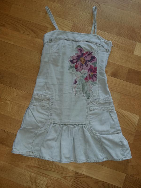 Хлопковый стильный сарафан KENZO на 8-9 лет. Темно-песочного цвета, с яркой аппликацией, сбоку застегивается на молнию. Замеры: ПОГ- 33, длина с бретелью-71