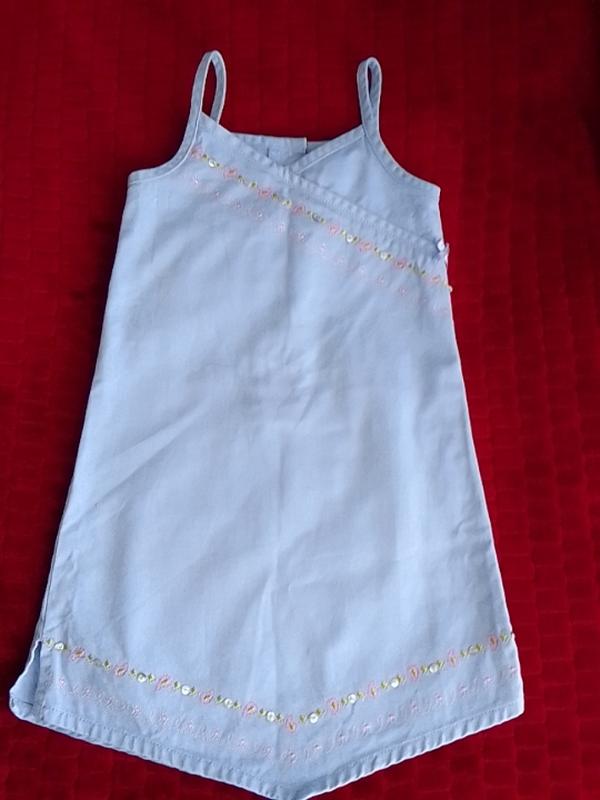 джинсовый сарафанчик на лето светло голубого цвета с красивой розово золотистой вышивкой, разрезами по бокам, указан на 3 рны. Длина от верха бретелей до низа 57 см.