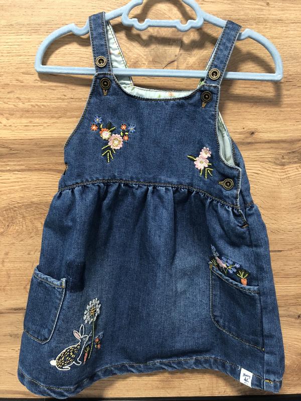 Стильний джинсовий сарафан для дівчинки. Натуральні тканини, якісне пошиття, декорування вишивкою. Комбінезон з накладними кишенями та регульованими бретельками. Верхня частина - на підкладці з 100% бавовни. - Модель на бретельках. - Застібається на кнопки. - Денім з вишивкою. - Спереду і ззаду вишивка. - Бокові металеві ґудзики. - Бретелі регульовані. - Зверху квіткова підкладка. - Декоративні деталі. - металева фурнітура. У такому вбранні красиво, стильно і зручно! Підходить на вік - 12-18 місяців, на зріст 86см. Заміри: Талія: 28 см Ширина під пахвами: 27 см Загальна довжина: від 47 до 50см (залежно від довжини регульованих бретельок). Стан ідеальний.