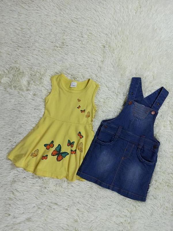 Комплект сарафан джинсовый и мягенькое хб платьице с бабочками. Состояние отличное, без нюансов. Сарафан на кнопках, лямочки регулируются на две длины. Сарафан: длина 48/50см, ПОТ 27см, ПОБ 30см. Платье: длина 45см, ПОГ 24,5-27см, ПОТ 22,5-25см. Покупайте и носите с удовольствием!)