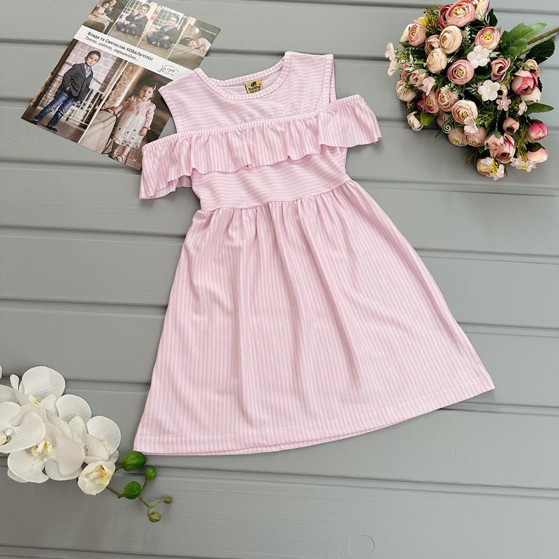 🌹Сарафан розовый в полоску, легкий. Имеет красивое кружево, с открытыми плечечками. Производитель Турция. Тканина бавовна. 📐Замеры: (116-122) - длин. 59/полуобхв.27 (122-128) - длин. 63 / Полуобхв.28 (128-134) - довж. 64 / Полуобхв.28 (134-140) - длин. 66 / Полуобхв.30 (140-146) - довж. 70 / Полуобхв.32