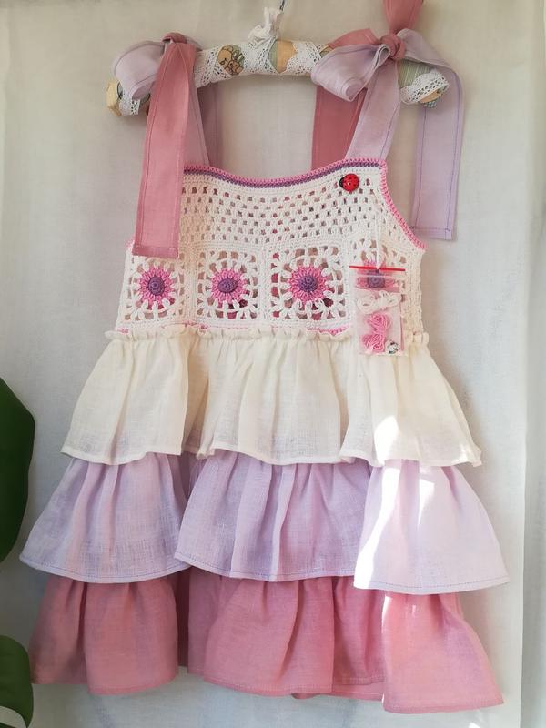 Оригинальный детский летний сарафан, платье. Вязанная бело-розовая вязаная вставка с пуговками Hello Kitty. Юбка из натурального льна 100% ярусами. Регулируемая высота, бретельки-завязки. Приятный к телу, не жаркий. Высота: 46см Бретельки-завязки: 58см Прекрасный подарок для родственников, крестниц.