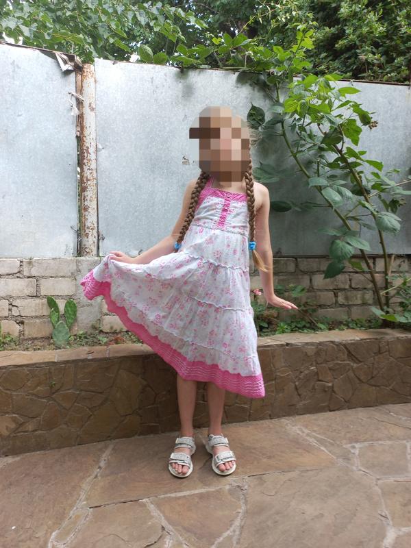 Красивий,легкий і зручний сарафан на 6-9 років.Одягнений на 132 см 9 рокіа.по бірці на 6 років.Бавовнв 100% і підкладка,також.збоку на блискавці.Довж.88,НОГ 32,НОТ 30