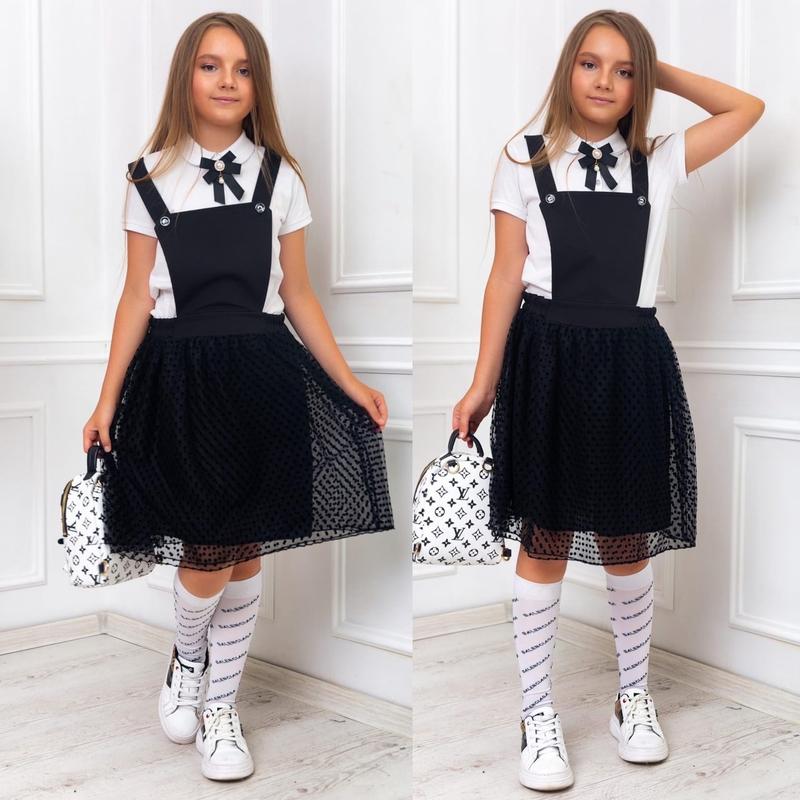 Сарафан арт. sev. 712 Размеры: 128, 134, 140, 146, 152 Ткань: креп костюмный Турция Цвета: черный и темно-синий Сарафан считается эталоном комфорта и практичности. Данная модель в черном и темно синем цвете. Верх выполнен из крепления костюмки, а юбка из нескольких слоев мягкой и приятной к телу трикотажной ткани + сетка, для создания пышности. Отлично сочетается с любым верхом гольфами, блузами, джемперами.