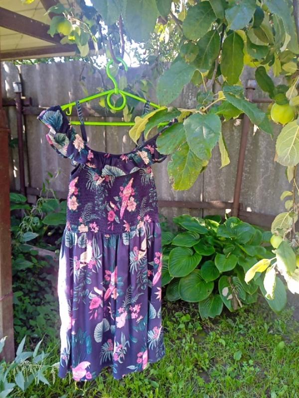 на.10-12р, длина 77з брителями,пог33,верх весь прорезинений,стан дуже хороший, принт папуги, Індія., вискоза, отправка от 125 грн, два рази на тиждень