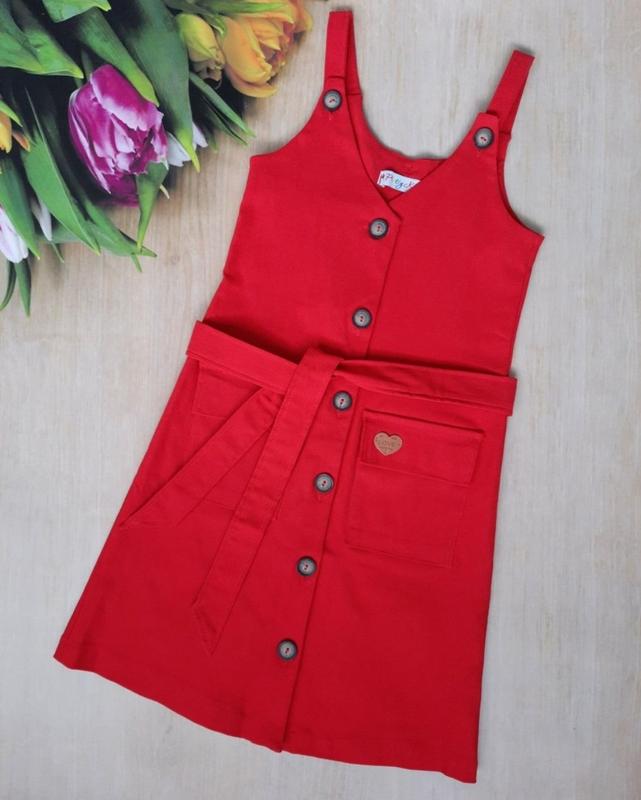 Дуже класний сарафан для дівчаток. Тканина - стрейч котон, дуже добре тягнеться. Сарафан застібається на гудзики, має два функціональних кармани, пояс іде в комплекті. Заміри: 140 см - довжина сарафана з брительками 77 см, пог 33 см. 146 см - довжина сарафана з брительками 81 см, пог 34 см.