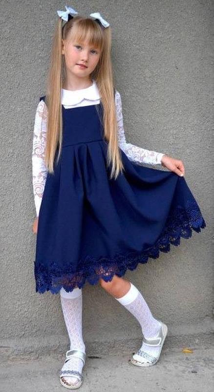 Сарафан мод.юм Цвет темно-синий ткань - костюмный габардин, низ декорирован плотным кружевом, цвета: черный и т-синий, размеры: No1 - на рост 116-122см, ОГ (обхват груди) - 65-68см, длина - 63см, с кружевом -68см No2 - на рост 128-134см, ОГ - 69-72см, длина - 67см, с кружевом -73см