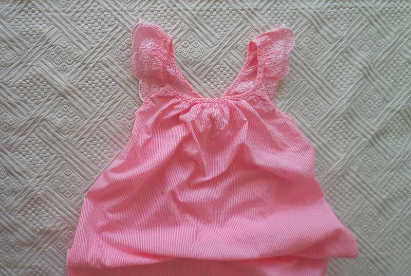 Сарафан летний, в розово-белую полоску. На 7-8роков. Рост 128 см. Индия. Состав: 67% хлопок, 33% полиэстер. Тканина жатка, не мнеться. Сарафан мягкий, нарядный, легкий. Вверху утягивающая вставная резинка. Лямки сарафана нарядные, из прошвы, с фигурными краями. Замеры: Длина юбочки 55см Длина лифа 19см Длина общая 73см