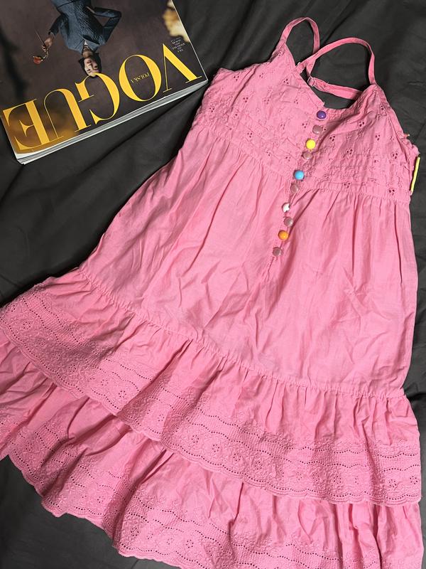 Очень красивое платье, состояние идеальное Долина с рюшами-53см Ширина зверху-26см Лямочки регулируются По бірці 6/116-128