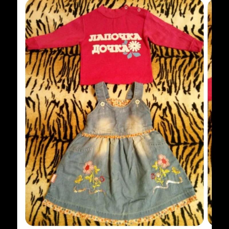 Приблизительный возраст ребенка 1 - 2 рочки Длина сарафана 47 см и 44 см В талии 23 см Цена 70 грн Футболка малинового цвета с надписью Лапочка Дочка в красивом состоянии. Длина футболки 30 см В груди 24 см В рукаве 23 см Цена 40 грн