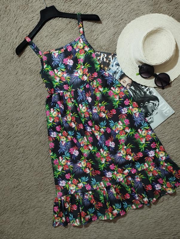 В отличном состоянии. Красивое цветочное платье с оборкой на девочку. Тканина легка, тягнеться. Размер на 11-12 лет, но смотрите по замерам Замеры (полуобхват): Грудь 33 (тянется до 39) Талия 32 (тянется до 38) Стегна 52 Длина со шлейками 85