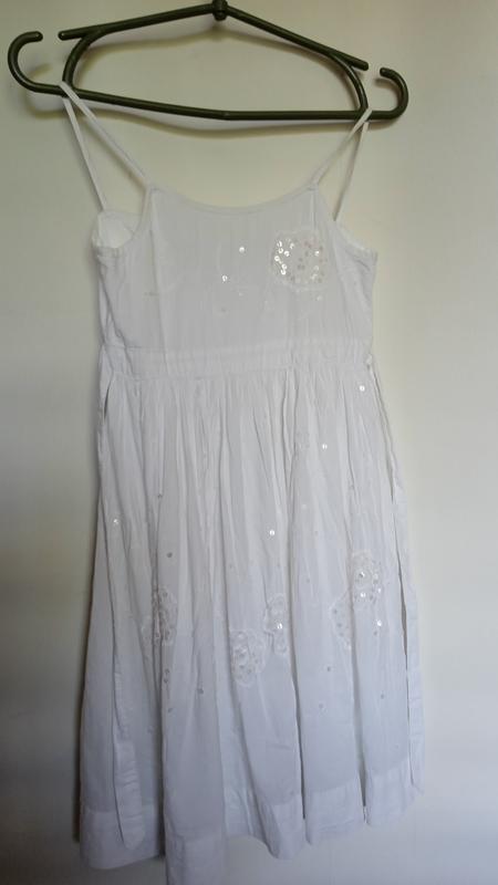 сарафан на дівчинку,коттон,білий,вишитий пайєтками,на тонкій коттоновій підкладці,довжина від верхньої точки бретель75,довжина по бічному шву60см,пог34,пояс півобхват 31,