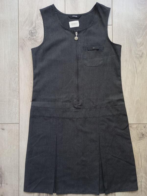 Сарафан серого цвета с заниженной талией для девочки ⦁ Круглый вырез ⦁ Без рукавов ⦁ Застежка-молния спереди ⦁ Подвеска-молния ⦁ Заниженная талия • Teflon® EcoElite Накладной карман Цвет серый Размер 128 см