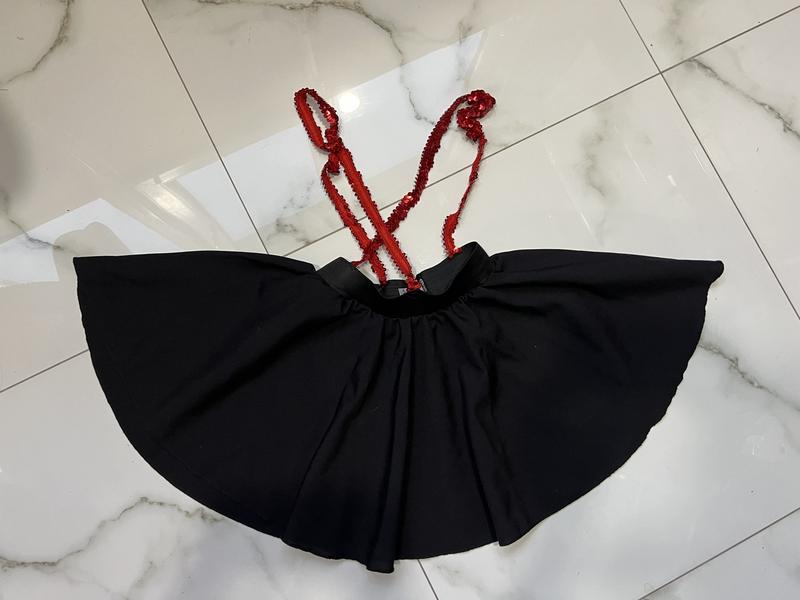 Спідниця чорна. Резинка на поясі. Шлейки вшиті паєтками ( тягнуться бо з резинок).