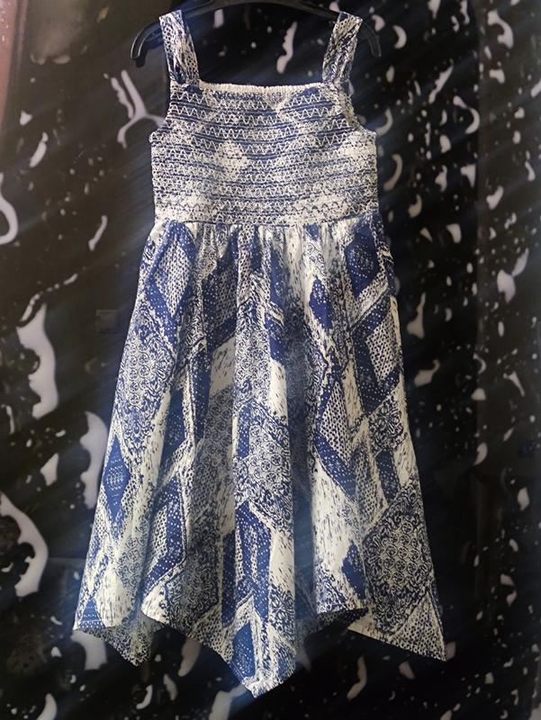Сарафан асимметричный. Максимальная длина 78 см ПОГ 28 см. Лиф выполнен из резинки. Есть подъюбник. 100% хлопок.