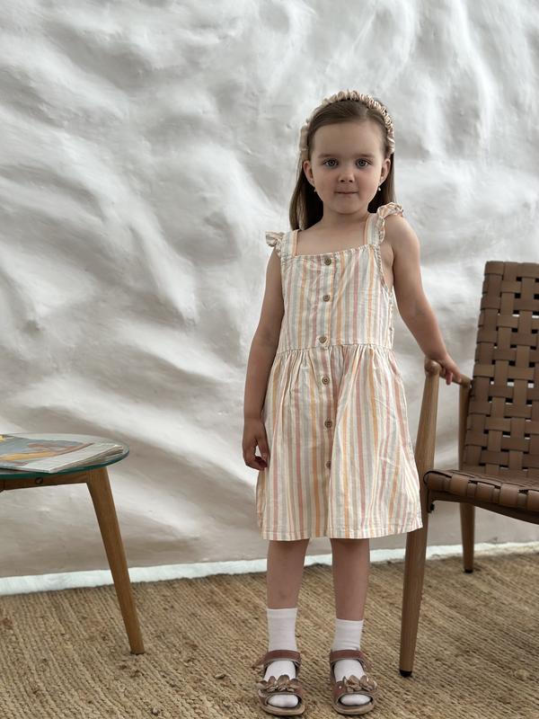 Платье из нежной хлопковой ткани от H&M. Плечевые лямки с рюшами, которые соединяются сзади, и узкой резинкой вверху сзади. Гудзики спереди, собранный шов на талии и расклешенная юбка. Без подкладки. 📌 Размеры: ➖12-18мис(86см) ➖2-3р(98см) ➖3-4р(104см)