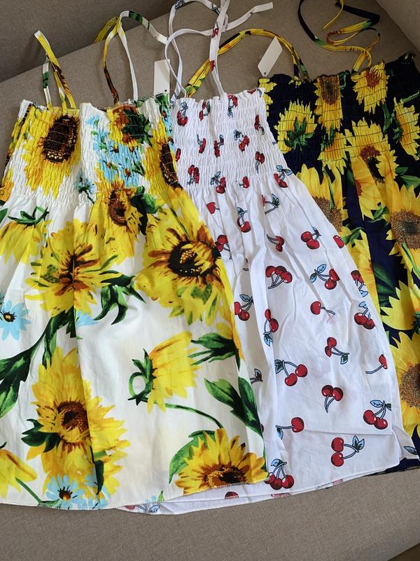 З темними соняшниками відсутній. Дуже гарні, тоненька натуральна тканина. Дуже зручно що є можливість регулювати завʼязочки. По віку вказано на світлому з соняшниками 4-5р. його довжина 49см. На двох інших 5-6р. довжина 50см. Довжину вимірювала по тканині від завʼязок. На своїй сторінці маю інші дитячі та дорослі речі, заходьте😊