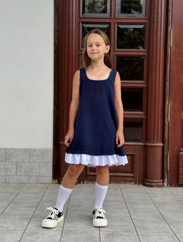 Сарафан мод №1077 Цена 570 грн. Размеры: 122, 128, 134, 140, 146, 152 Ткань: качественная креп костюмка. Цвета: темно-синий и черный Лаконично и стильно одновременно!! Образ, который будет красиво смотреться не только в первый сентября! Сарафан свободно кроя, не сковывает движения. Подходит под любой образ