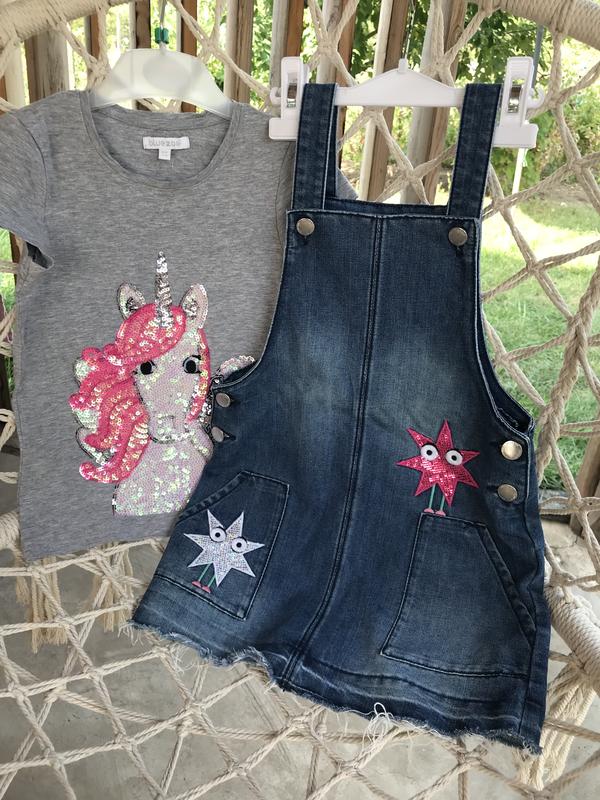 Комплект на 5-6 лет Длина футболки 40, пог 30 Длина сарафан 58, шир 32