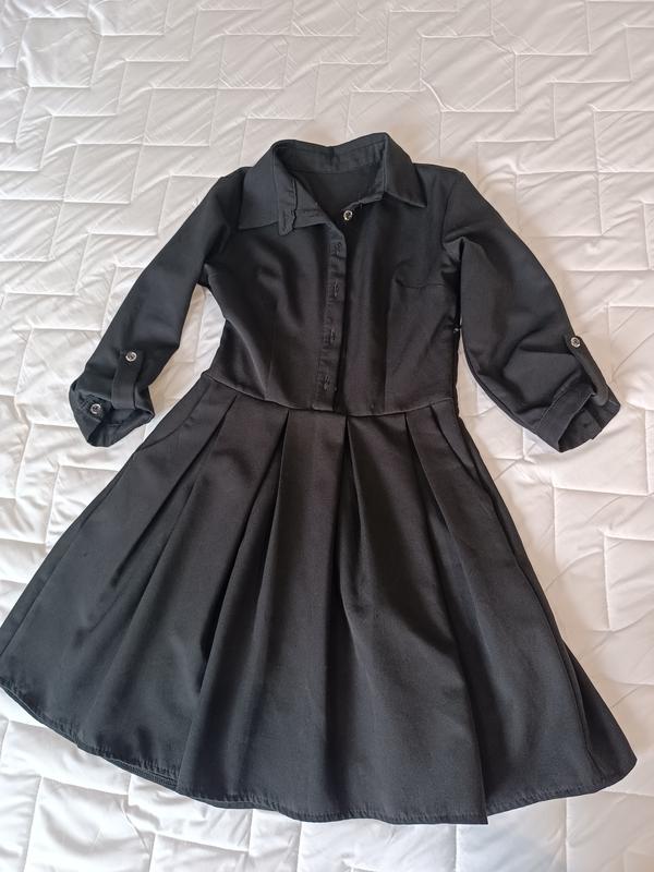 Черное платье в школу. Подойдет девочкам 9-10 классов. Размер S. Рукав три четверти, но можно еще больше закатать с помощью специального шкурочка. Спереди застегивается на пуговицы, и смок имеет застежку скрытого кроя.