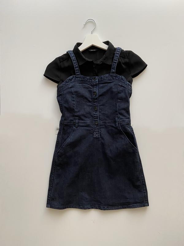 Распродавляю наш школьный гардероб по минимальной цене! Оригинальный джинсовый сарафан H&M для школы и не только! Возраст указанного 10-11 лет, тянется, подойдет дольше Цвет темно-синий, черные болты, можно вставить пояс 99% коттон, 1% еластан 250 грн В комплект черная блузка George 11-12 лет с кружевом 100 грн