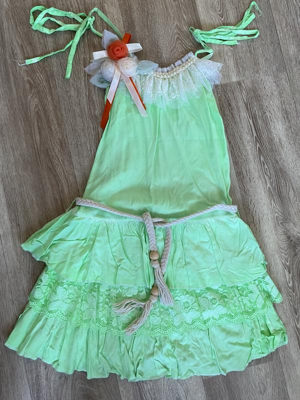 Очень нарядный,святочный.Ткань натуральная и очень легкая, ярко-салатовый цвет с эффектом вываренности.На спине резиночка. Выглядит очень стильно и ярко.Стан идеален. На 140 рост.Склад вискоза.Производитель Турция. Задавайте вопросы!бойтесь за просмотр)