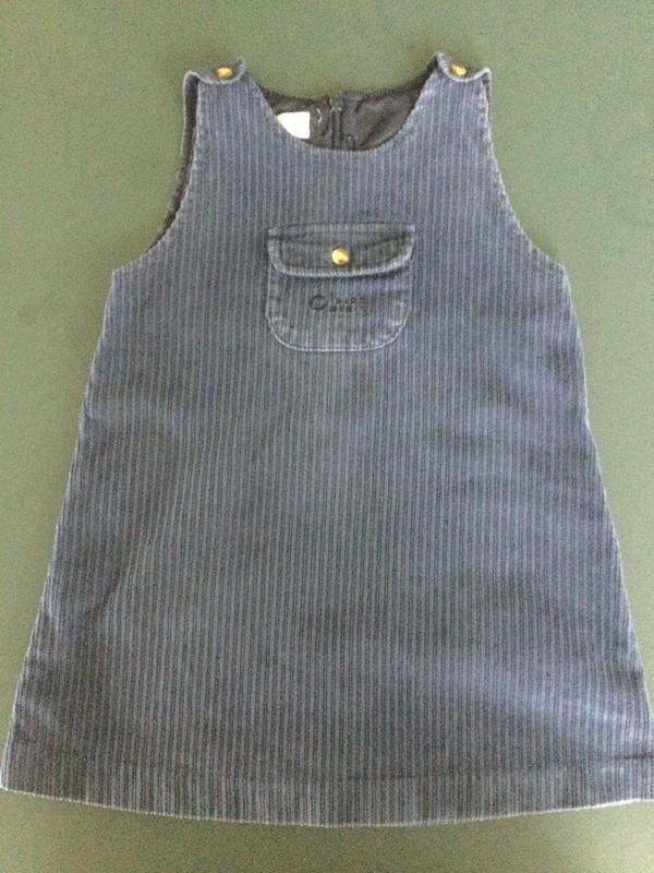 Сарафан темно-синий на 4-5 лет По спинке молния, на плечах пуговицы. Бавовна 100% Ширина по грудях 36 см Длина от плеча 57 см Есть незначительный дефект на подкладке