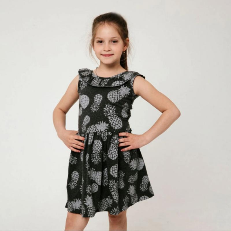 Летнее платье для девочки из кулира (100% хлопок) Платье отрезное и слегка занижено по линии талии, с завязывающимся поясом сзади. Волан по вырезу горловины переходит на спинку и создает красивый вырез сзади. Арт. 4119 Ткань: кулир Размер: 122, 128