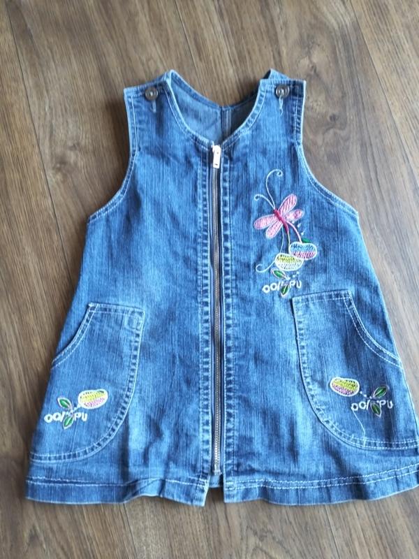 детский бу джинсовый сарафан:плечи-20 см, по груди-31/62 см, длина-46 см
