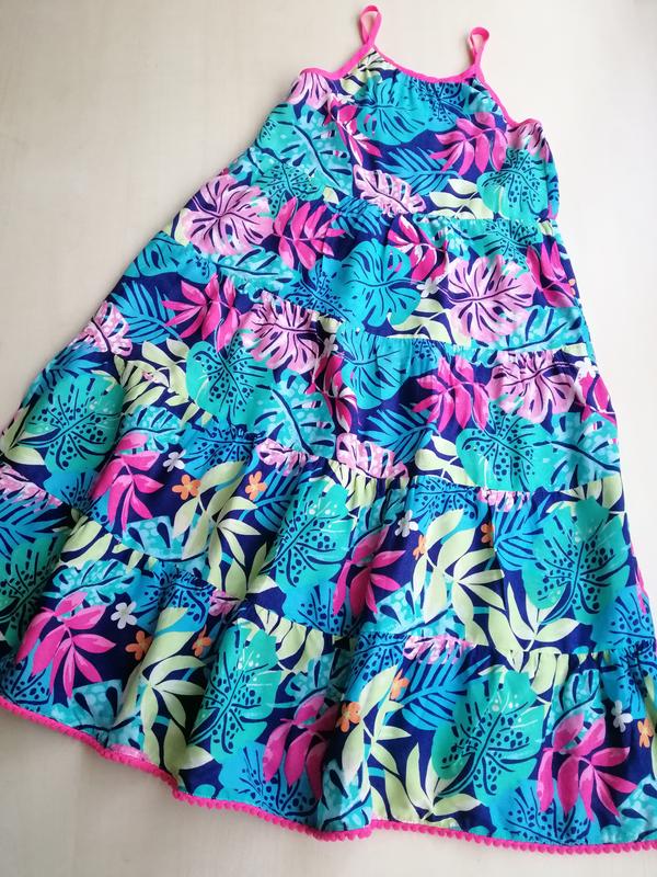 Классный летний сарафан Matalan, ткань 100% вискоза. Возраст указан 5 лет, но он длинный, может быть на больший возраст. В хорошем состоянии, без дефектов. Длина с бретелькой 80-81, длина от подмышки 63-64, ширина под руками 28 (сзади резинка, можно потянуть до 30), пояса 32, дальше широкая.