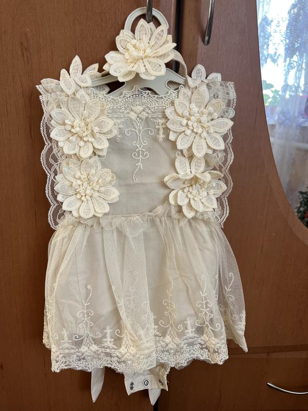 Боді-сукня з відкритою спиною, новий. На спині я пришила кнопки для зручності застібання, але так і не одягали . В комплекті повʼязка на голову. Розмір 70, але шлейки можна регулярно