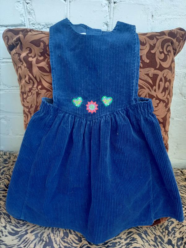 Синий сарафан на девочку с небольшим рисунком по центру. Тканина - крупний вельвет. Состав ткани: коттон - 70 %, полиэстер - 30 % Размер: Длина сарафана 57 см Плечи 25 см Объем ПГ 21,5 см Талия 27 Длина юбической части 35