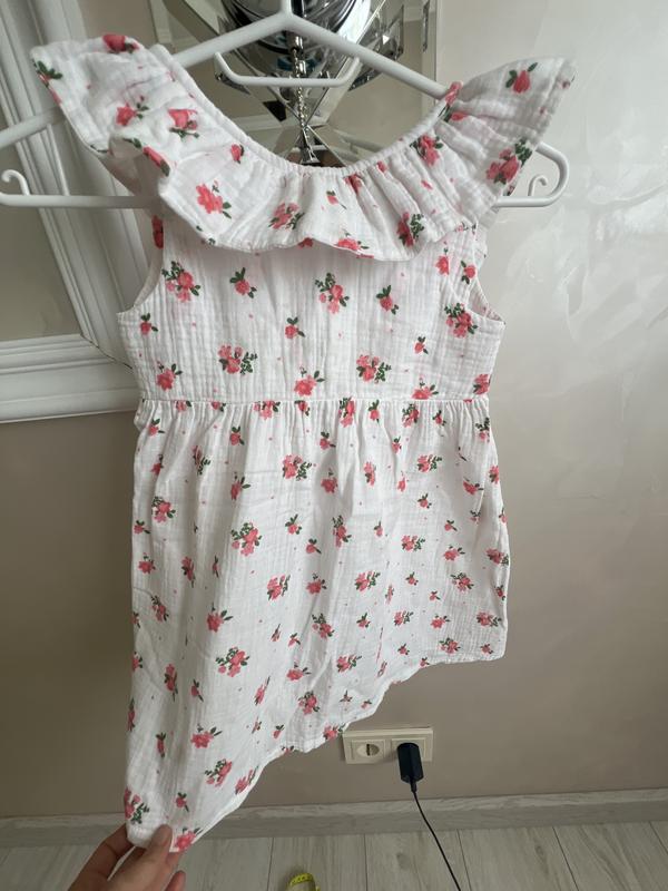 Сукня з мусліну. Ззаду завʼязується бантик. Довжини сарафану 53 см,напівобʼєм талії 30 см. Дуже приємна до тіла. Є ще в меншому варіанті.Розмір 86 см.